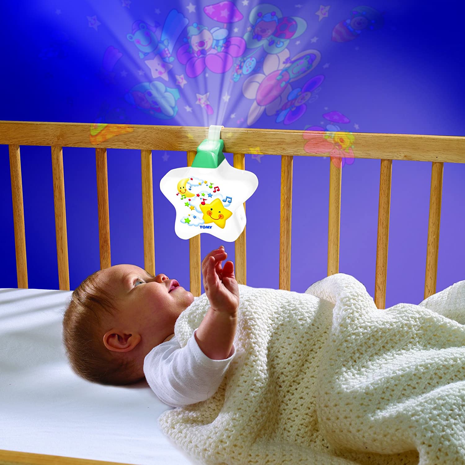 This yellow version of the popular Starlight Dreamshow is a magical way to soothe a baby to sleep. This star-shaped dream show projects magical, dream-time characters, stars and moons onto the ceiling. This mobile will put a baby to sleep with its soothing lullabies.