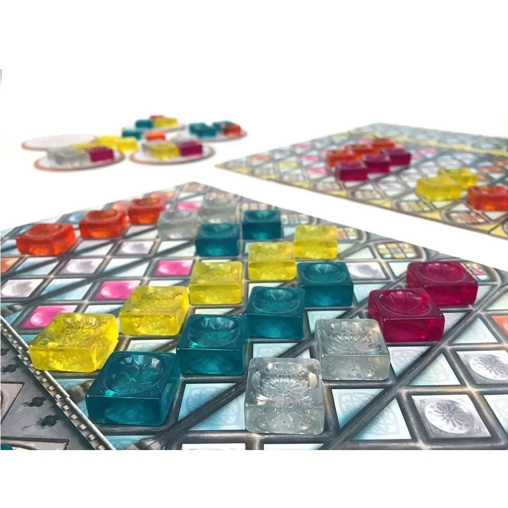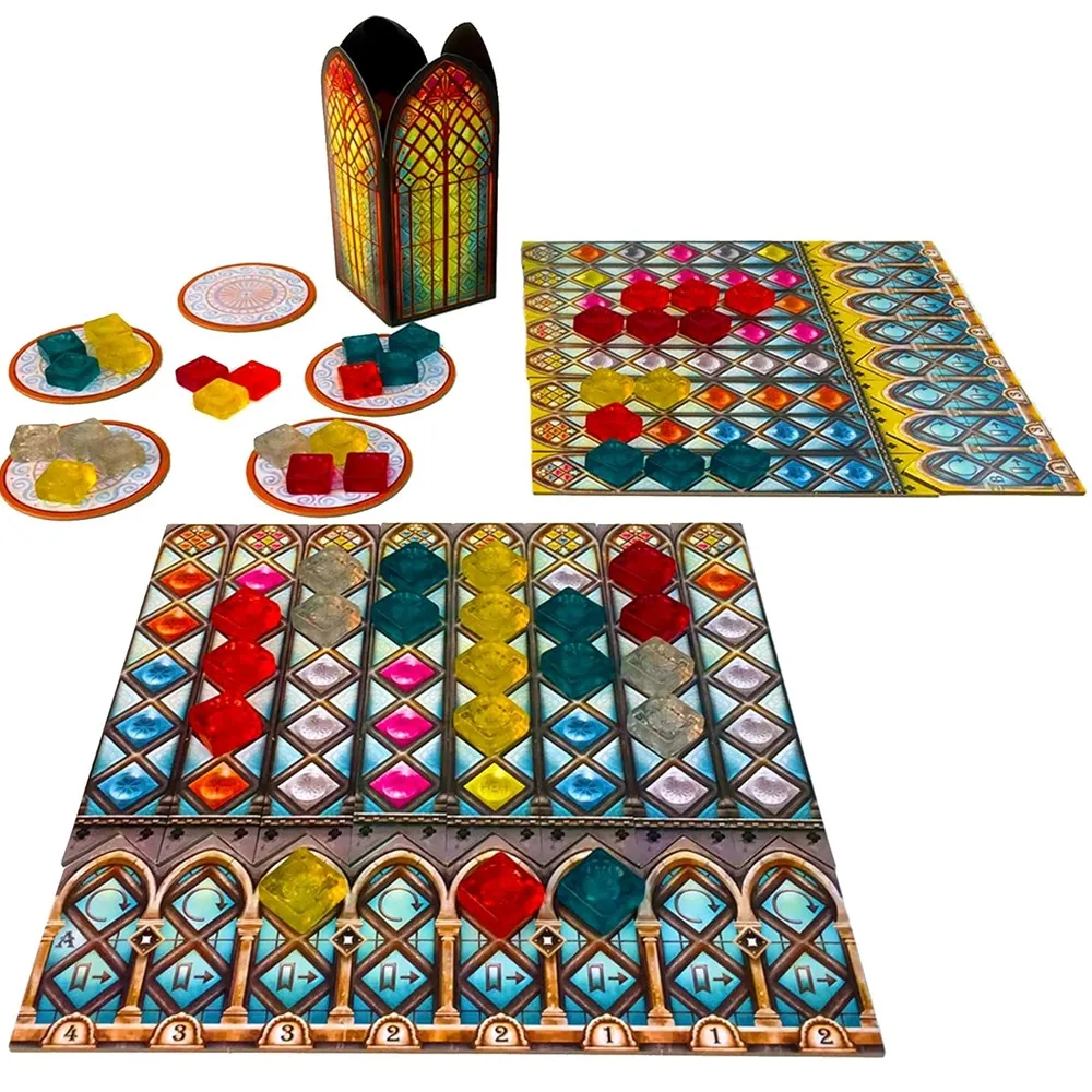 After furnishing the Palace of Evora, King Manuel I of Portugal now seeks to commission the world’s greatest stained-glass artisans to adorn the windows of the Royal Palace in Sintra. As a stained-glass artisan, this is a once in a lifetime opportunity to demonstrate your exquisite abilities for king and country. Will you be the best at creating the most beautiful stained glass in all of Portugal? Welcome back to the world of Azul! Contents: 9 Factory Displays 4 Palace Boards 32 Pattern Strips 4 Glaziers 8 Markers 100 Pane Pieces 1 Scoring Board 1 Starting Player Tile 1 Bag 1 Glass Tower 1 Rulebook Ages 8+ 2 – 4 Players 30 -45 Minutes of Playing Time Designed by Michael Kiesling.