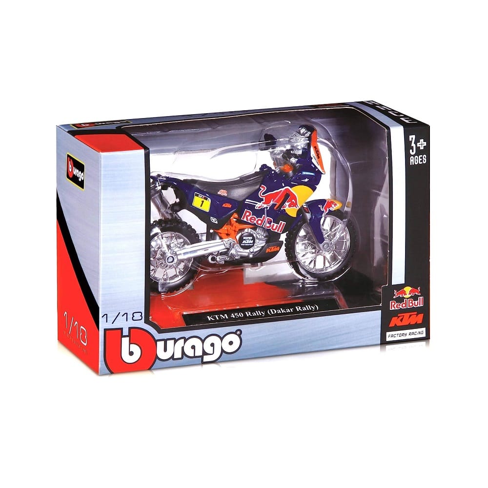 Officially licensed model of KTM 450 Dakar Rally in 1/18 scale by Bburago. Made with Diecast Metal and Plastic Edition. Ideal for collectors.