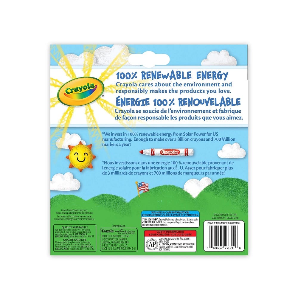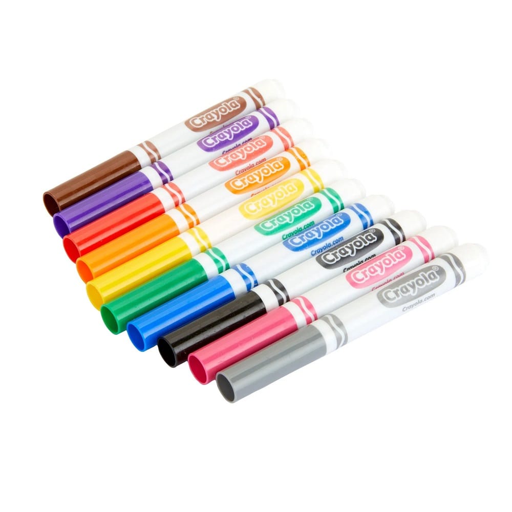 Kids can create in a rainbow of colours with this 10 count pack of Crayola Broad Line Markers. These nontoxic markers in classic colours are safe for children and perfect for school supplies and at-home art supplies. Little artists can express themselves with these bold colours and their own imagination! This assortment of markers features 10 classic Crayola colours with high quality, true-to-colour ink. Great for colouring in large areas, these markers also work well for drawing thin lines or dots. Broad line markers lay down plenty of colour and won’t smudge or bleed through paper.