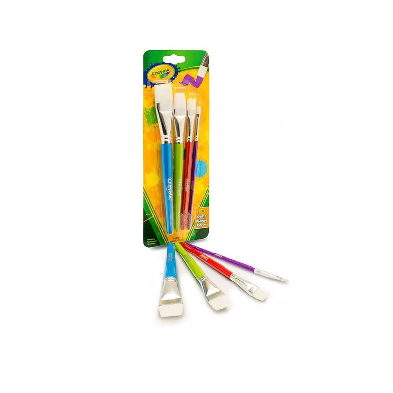 ASSORTMENT OF FOUR BRUSHES: The brushes feature brushed silver ferrules and measure from 1 inch wide to 1/4 inch wide. With four brushes in different sizes, kids can paint an array of lines and strokes.