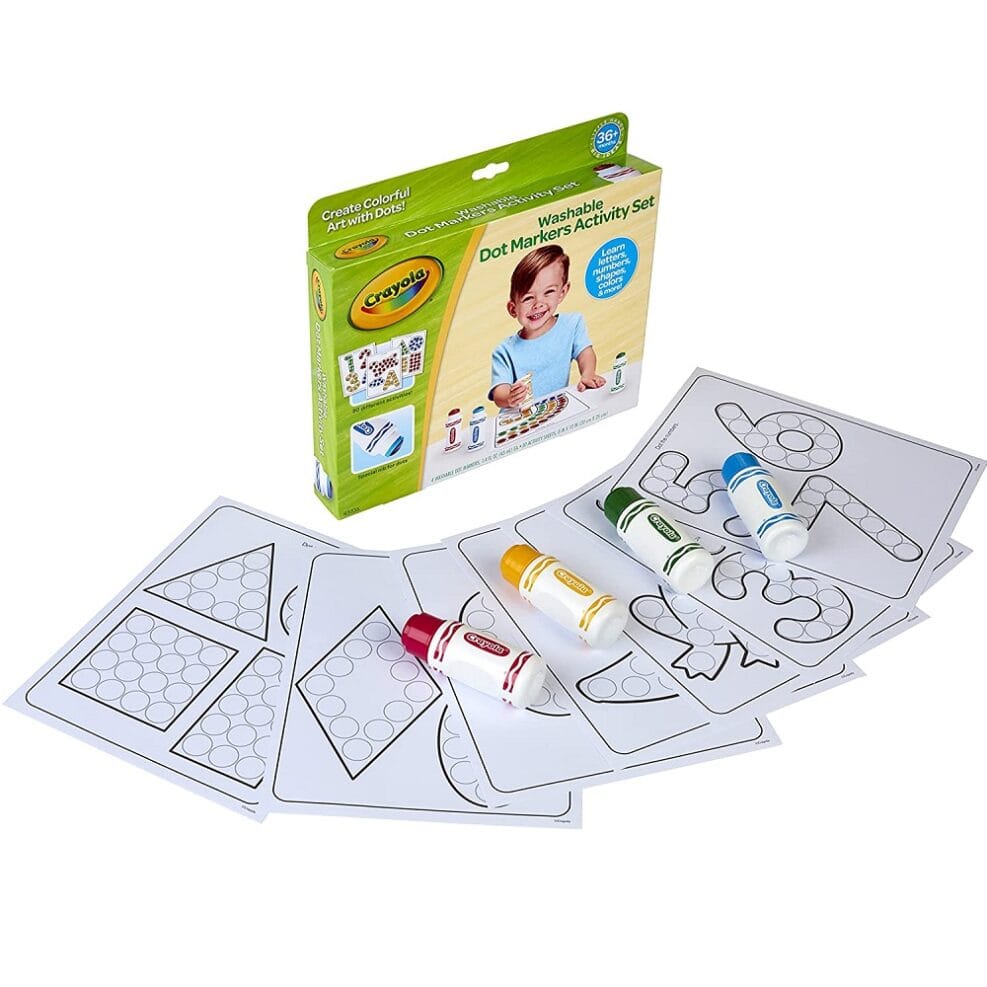 - CRAYOLA WASHABLE DOT MARKERS & ACTIVITY SET: Features 4 Washable Dot Markers (2.5oz ea.) and 30 Fun Activity Pages.