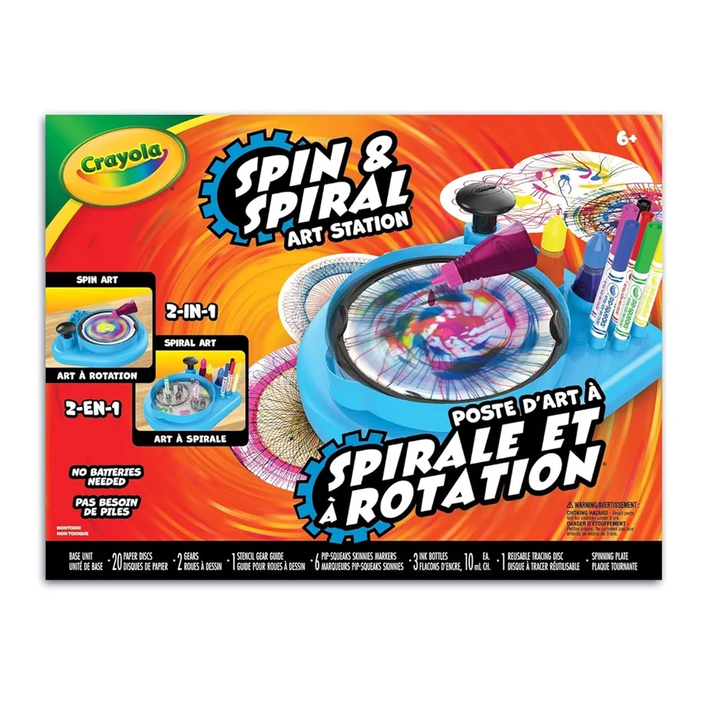 Featuring over 30 art supplies including the base unit, 20 paper discs, 2 gears, 6 Pip-Squeaks skinnies markers, and 3 ink bottles, everything needed to get started creating is ready right out of the box. Plus, the convenient guide makes it easy for kids to get crafting without a struggle! This art kit focuses on spin and spiral art activities, embracing kid-powered crafts that are fun and easy. While all the supplies needed to complete the art projects are in the box, when kids are ready for paper refills, your standard paper plates will work perfectly. This art kit is a creative gift for boys and girls, ages 6 & up. Give kids an effortless way to enjoy two classic art activities with one battery-free toy!