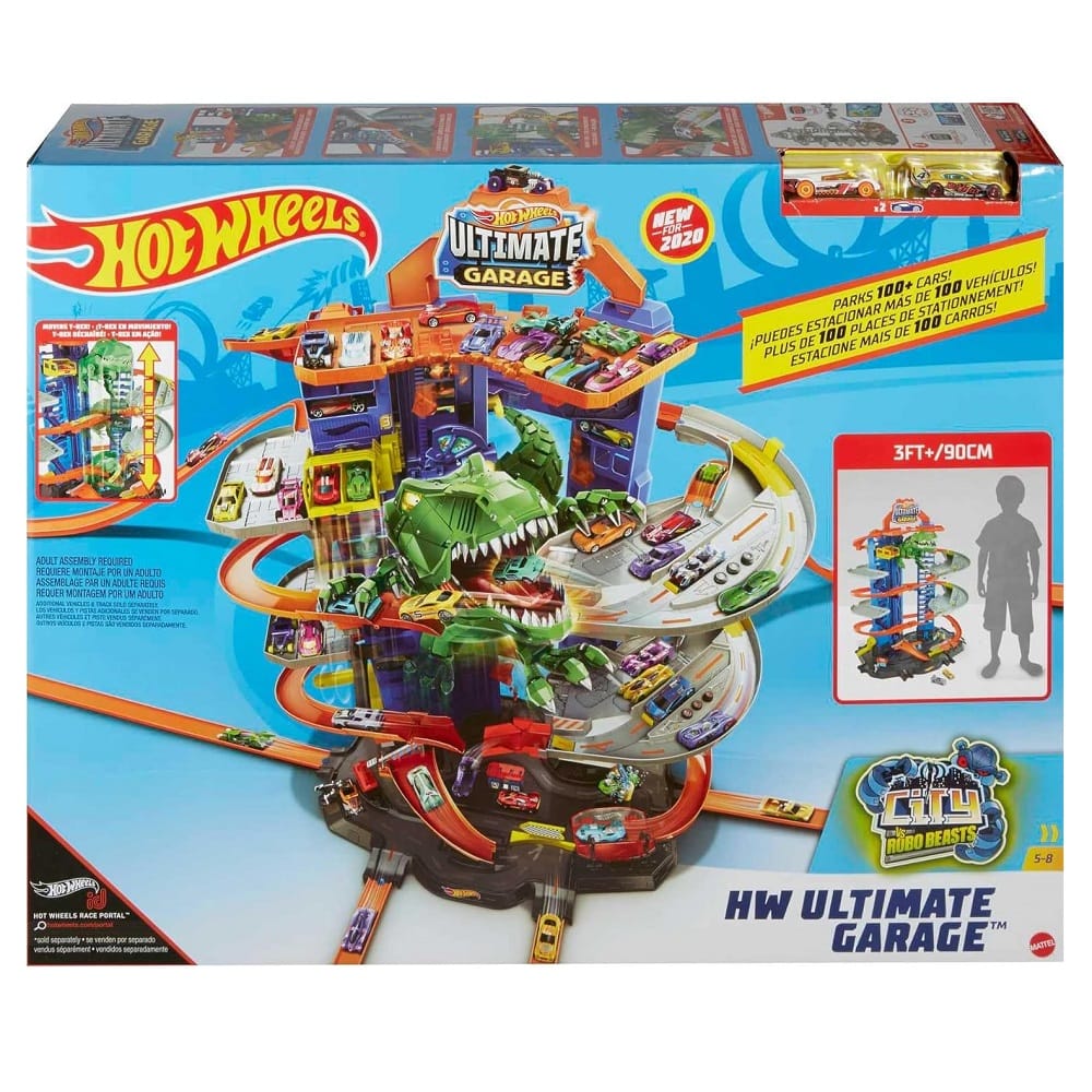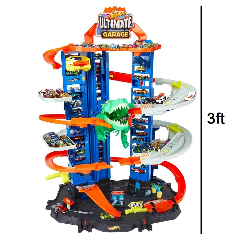 The Hot Wheels™ City Ultimate Garage is 3 feet tall, offering endless storytelling and vehicle action play! The enormous toy garage has parking for up to 100+ vehicles and a Robo T-Rex nemesis that fuels kids’ imagination. Take Hot Wheels® cars to the top in the kid-powered two-car elevator, then race down through the multi-level garage and experiment with multi-play mode for continuous thrills! Connects to other Hot Wheels® sets (sold separately) and includes two Hot Wheels® 1:64 scale vehicles. Colors and decorations may vary.