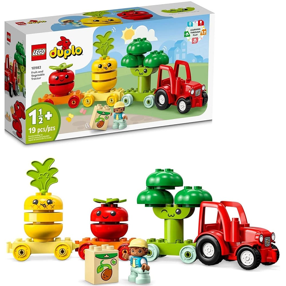 LEGO DUPLO Fruit and Vegetable Tractor toy helps toddlers ages 1.5+ develop fine motor skills as they stack the bricks to make the plants ‘grow’