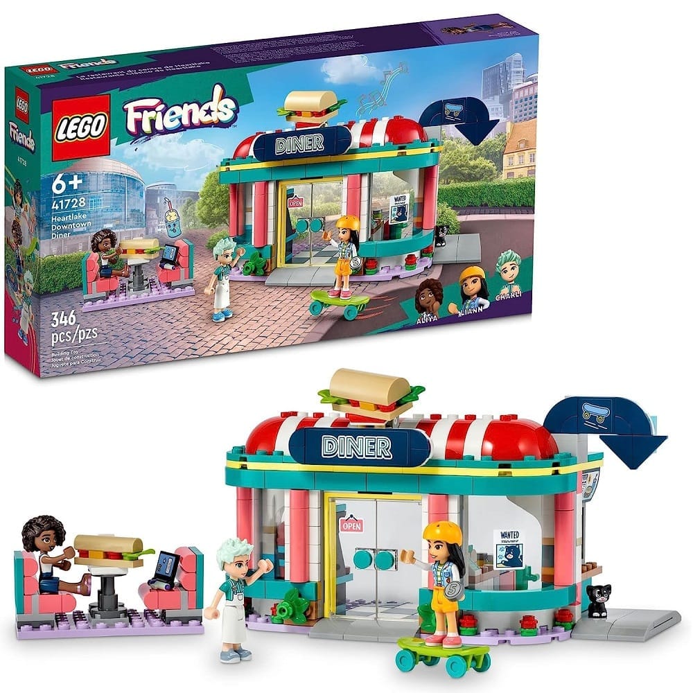 Food-loving children can role-play lots of restaurant stories with this LEGO Friends Heartlake Downtown Diner (41728) playset. This creative toy for kids Ages 6+ years old allows kids to make friends with the next generation of Heartlake City characters in a cool LEGO Friends restaurant. The restaurant playset has lots of features to inspire creative play, including a drive-through, outdoor seating, plus an arcade game and a moving jukebox. Kids can use the salad ingredients in the fridge and pretend to make sandwiches or imagine being a customer at the diner.