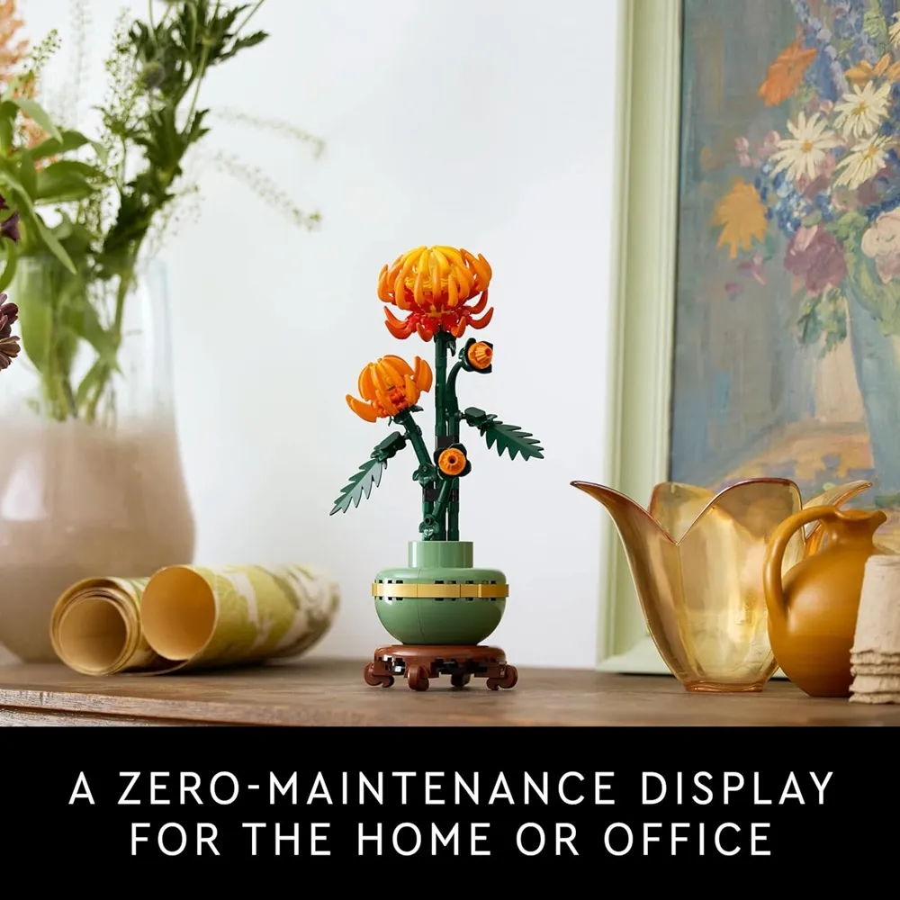 This detailed replica, with posable leaves and petals, captures the vivid orange flower in bud, blooming and in full bloom and comes with a pastel-green flowerpot decorated with a golden band and set on a wood-effect plinth. Easy to assemble, the model chrysanthemum plant makes an elegant centrepiece for any space and can be displayed alongside other sets from the LEGO Botanical Collection (sold separately).