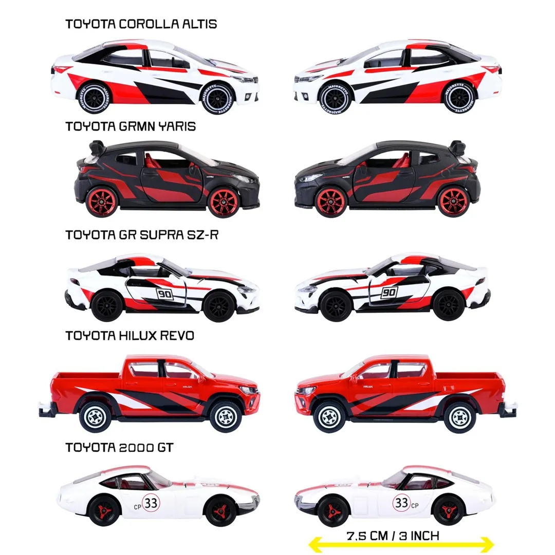 Conquer the racetrack with the officially licensed Majorette Toyota Racing Cars: Five impressive metal cars are just waiting to race with you and become the highlight of your model car collection! The exquisite selection of toy cars shows the wide range of Toyota vehicle models: from sports coupés to limousines.