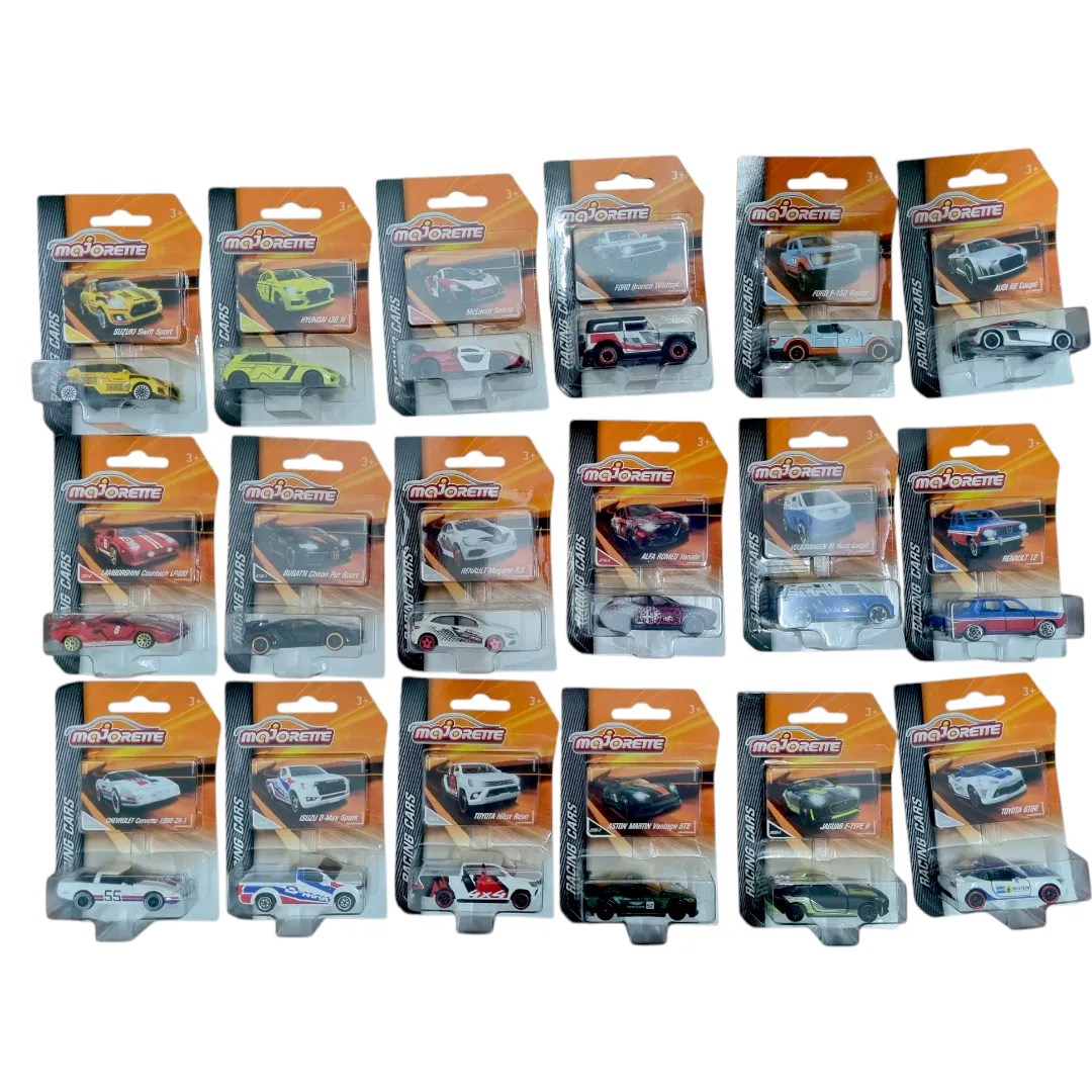 Set of 18 Majorette 1:64 Racing Car Models including Renault Megame R.S, Hyundai i30 N, Bugatti Chiron Pur Sport, Isuzu D-Max Spark, Audi R8 Coupe, Renault 12, Volkswagen ID Buzz Cargo, Aston Martin Vantage GT8, Alfa Romeo Tonale, Chevrolet Corvette 1990 ZR-1, Lamborghini Countach LP-400, Suzuki Swift Sport. Mclaren Senna, Toyota GT86, Jaguar F-Type R, Ford F-150 Raptor, Toyota Hilux Revo. Officially licensed.