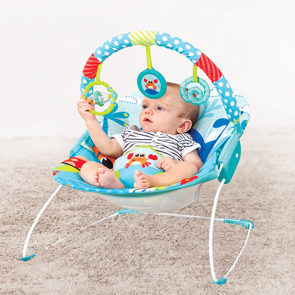 Mastela melodies & soothing vibrations calm the baby with a removable plaything bar for easy access to the baby. This unique cradling seat for your baby has fun has playthings along with an adjustable 3-point harness that keeps the baby secure
