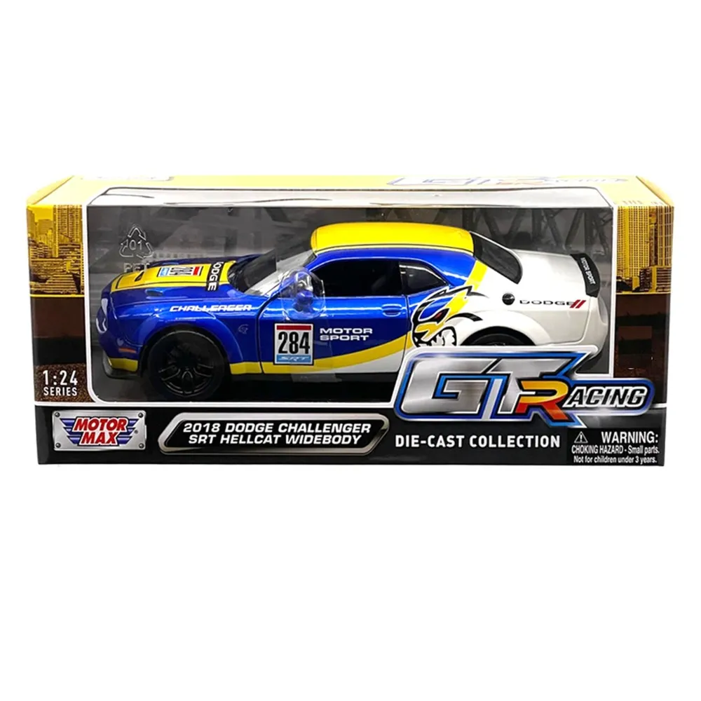 Unleash American muscle in miniature form with the Motormax 1/24 Scale GT Racing – 2018 Dodge Challenger SRT Hellcat Widebody. This diecast model captures the aggressive stance and raw power of Dodge’s legendary performance machine, reimagined in racing trim for collectors and enthusiasts.