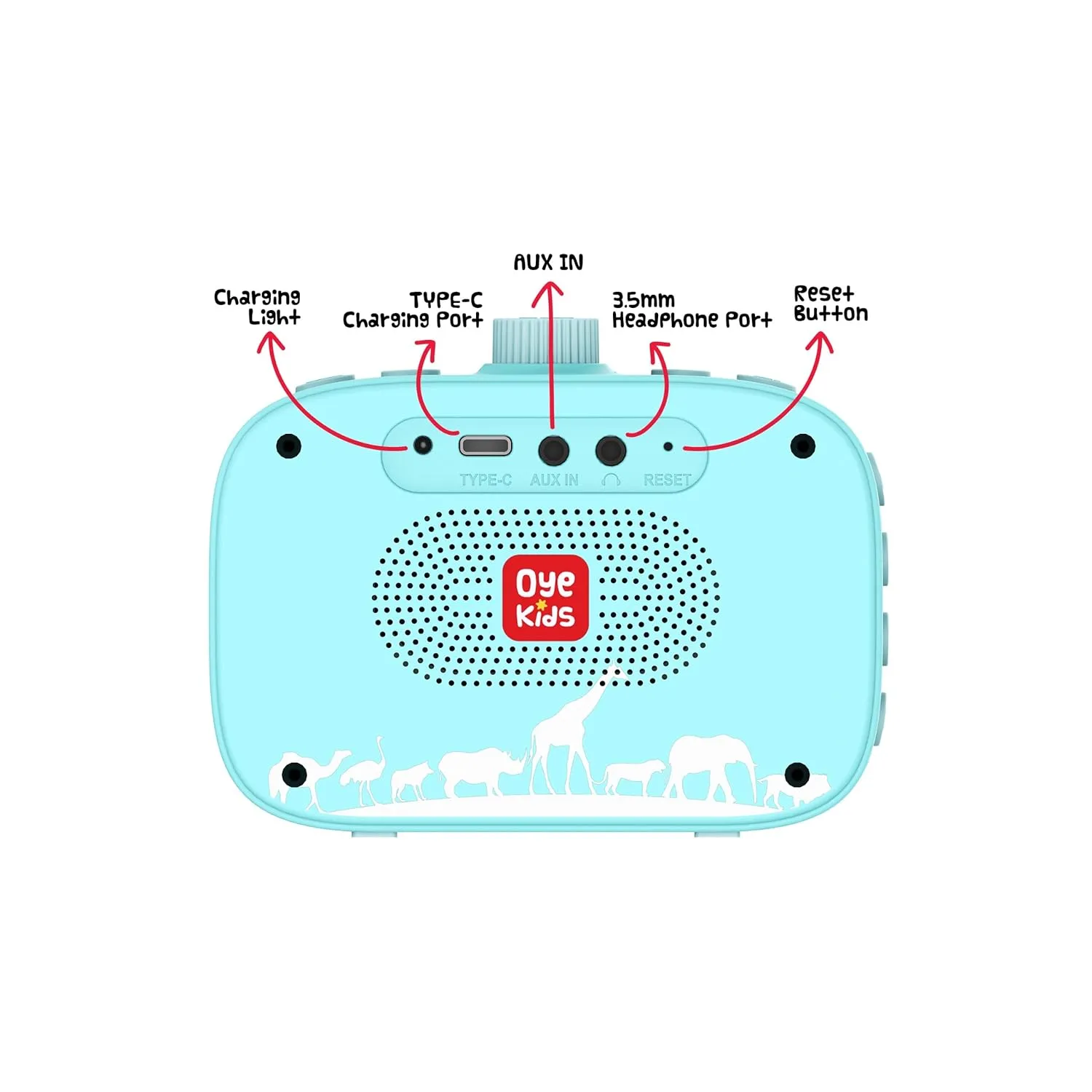 Oye Kids Story Box Story telling Speaker with 1000 stories in Hindi and English. Electronic learning toy for kids Age 3 to 10. With Remote/Rechargeable Battery/Bluetooth/USB/Aux in-Out/Dual Language Birthday Gift For Kids Boys Girls Children Babies Empower imagination with 1000+ stories in Hindi and English languages. New age story telling speaker for alpha Generation Kids! Where Imagination meets education! Screen-free entertainment that nurtures creativity, Imagination and connects to roots and values. We are bringing back the magic of storytelling, one story at a time. Introduce your little ones to the joy of stories with this adorable elephant-themed story telling speaker from Oye Kids. The charming turquoise blue device features a delightful elephant face design with a mesh speaker cleverly integrated into the design. Perfect for children’s rooms or playtime, this portable speaker comes with easy-to-use control navigations along with the remote. The compact size makes it ideal for little hands to carry around also durable for daily use. The speaker includes intuitive controls for volume adjustment and track selection, making it simple for children to operate both on the device and Remote.