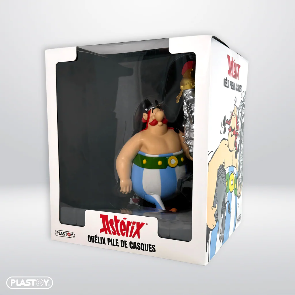 - Immerse yourself in the world of Asterix with this Obelix figurine, carrying a stack of Roman helmets as a trophy of his exploits.