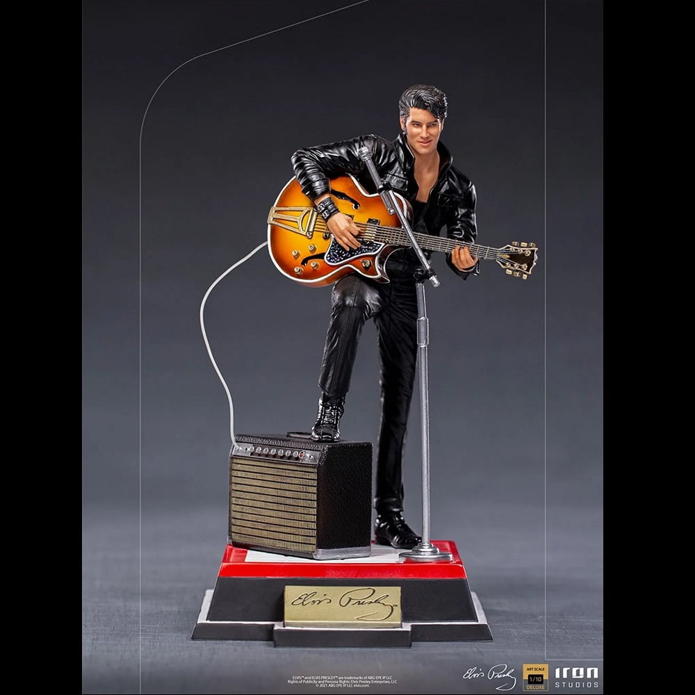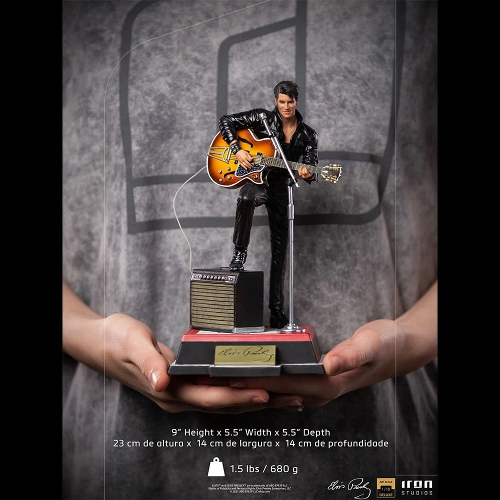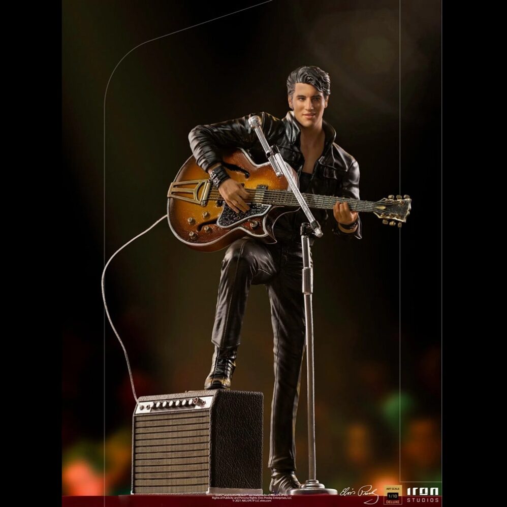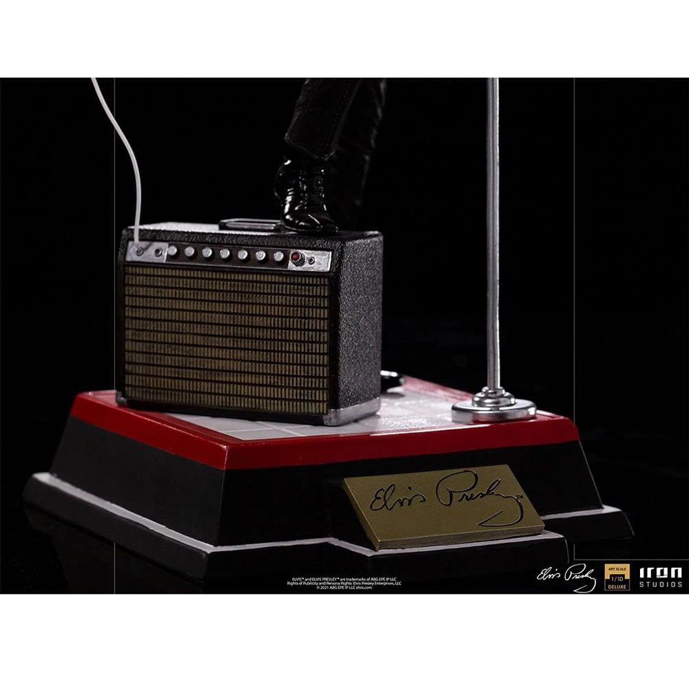 On a red and white base, which reproduces part of the real stage of his show, and with his signature on the front, he poses with his right leg on his “Benson 200” amplifier, supporting his semi-acoustic guitar “Gibson Super 400 CES 1963 “. The statue also has a microphone stand with a peculiar round base in front of it. In this way, Iron Studios proudly presents its “Elvis Presley Comeback Deluxe Art Scale 1/10 – Iron Studios” statue, replicating the legendary King of Rock in one of his most acclaimed performances, also the first figure derived from the pop music universe produced by Iron Studios.