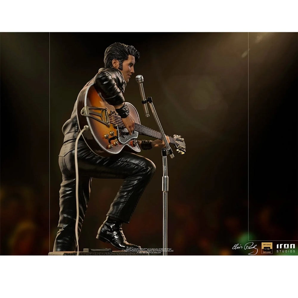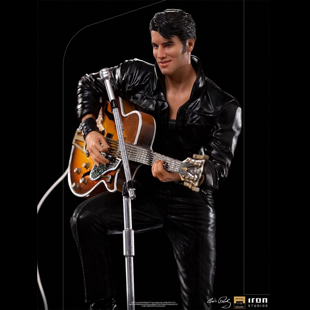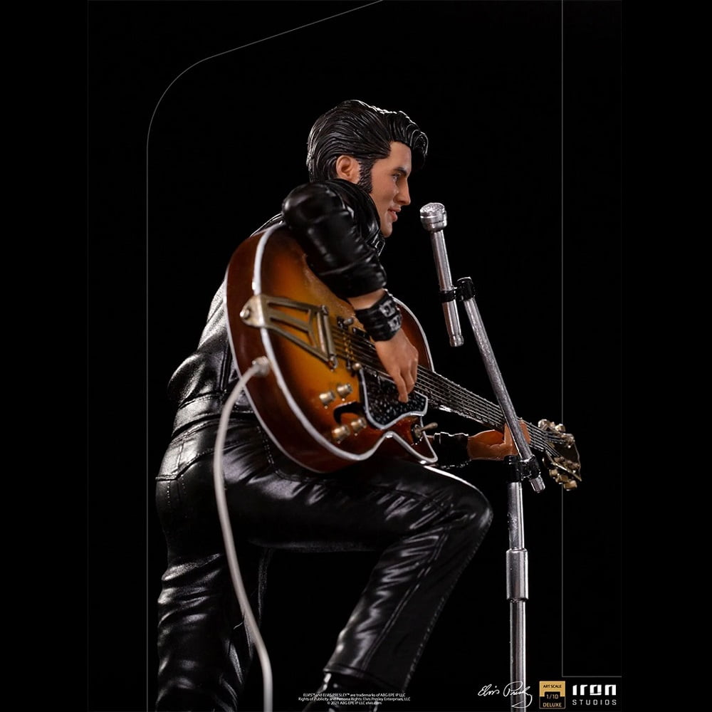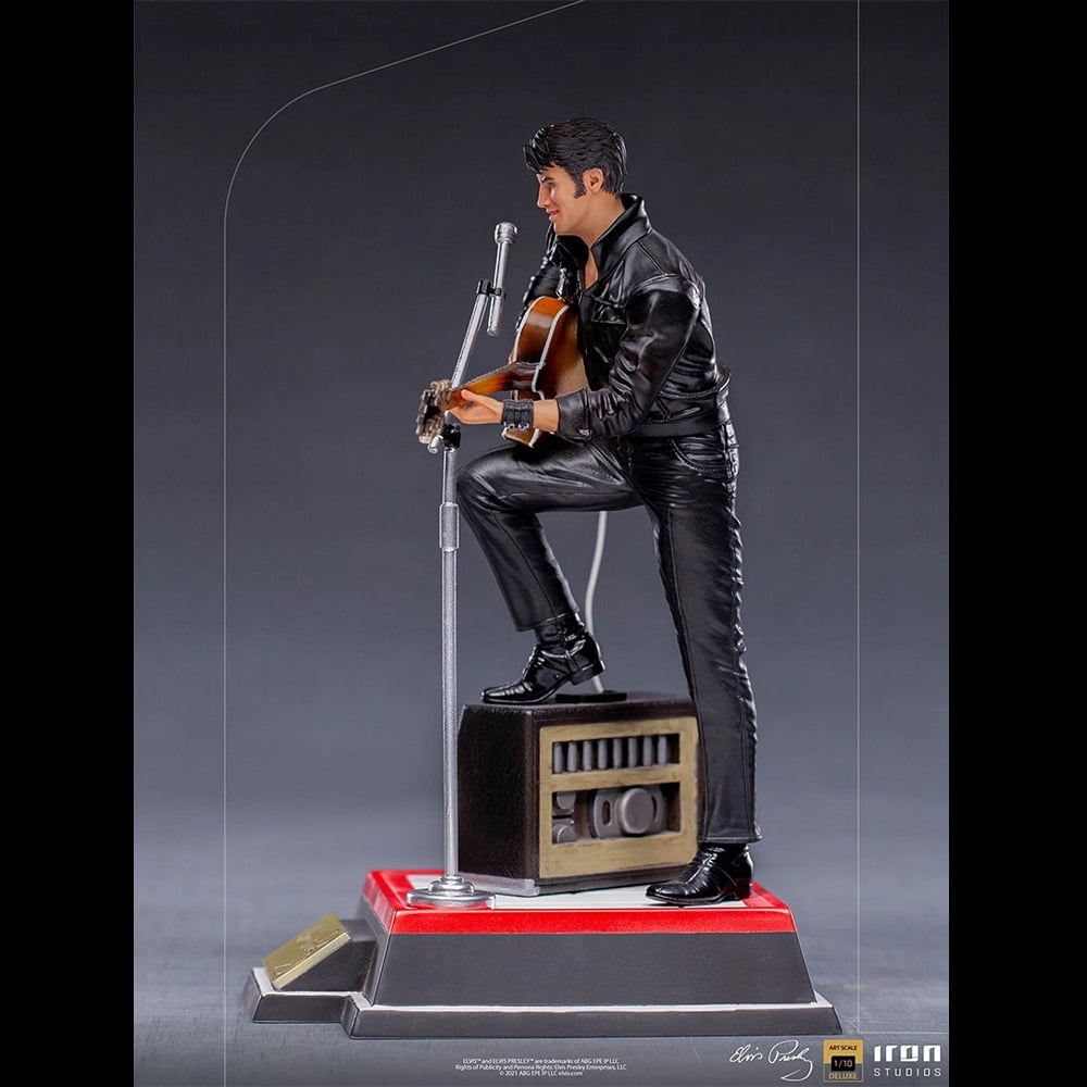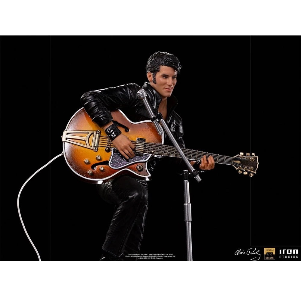On a red and white base, which reproduces part of the real stage of his show, and with his signature on the front, he poses with his right leg on his “Benson 200” amplifier, supporting his semi-acoustic guitar “Gibson Super 400 CES 1963 “. The statue also has a microphone stand with a peculiar round base in front of it. In this way, Iron Studios proudly presents its “Elvis Presley Comeback Deluxe Art Scale 1/10 – Iron Studios” statue, replicating the legendary King of Rock in one of his most acclaimed performances, also the first figure derived from the pop music universe produced by Iron Studios.