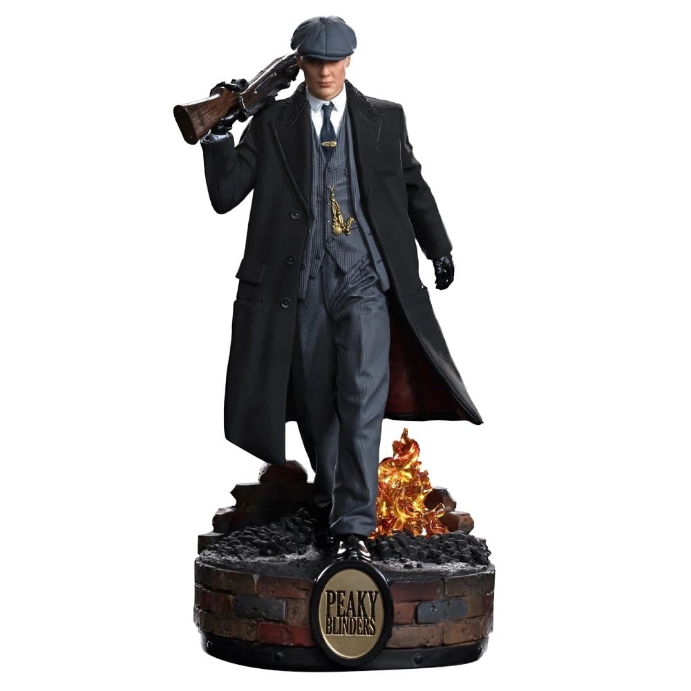 Elegantly dressed in a black overcoat over a gray suit, the fearsome figure of the gangster leader from a powerful criminal organization walks over a rustic pedestal, that refers to the dirty streets of the British city of Birmingham in the 1920s, with the floor filled with coal and flames, surrounded by old bricks and displaying the series’ logo on the front. Bringing his submachine gun on his right arm, held by his gloved hands, resting it on his shoulder, with his head covered by his characteristic gray newsboy cap, Iron Studios present the statue “Thomas Shelby – Peaky Blinders – Art Scale 1/10”, with the main protagonist from the successful British crime-drama TV series Peaky Blinders.