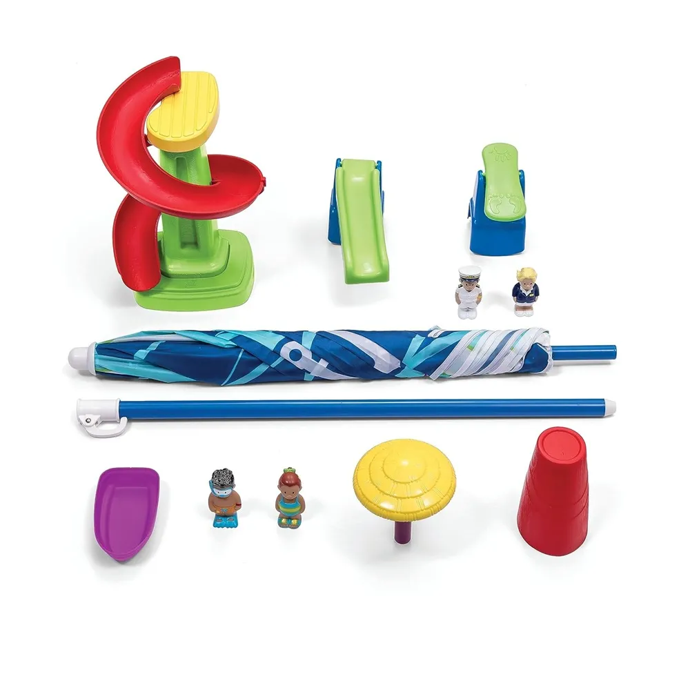 - With a slide, flipper, and loop-de-loop spiral tower slide, and more accessories included, this water table is packed with land and sea-themed play!