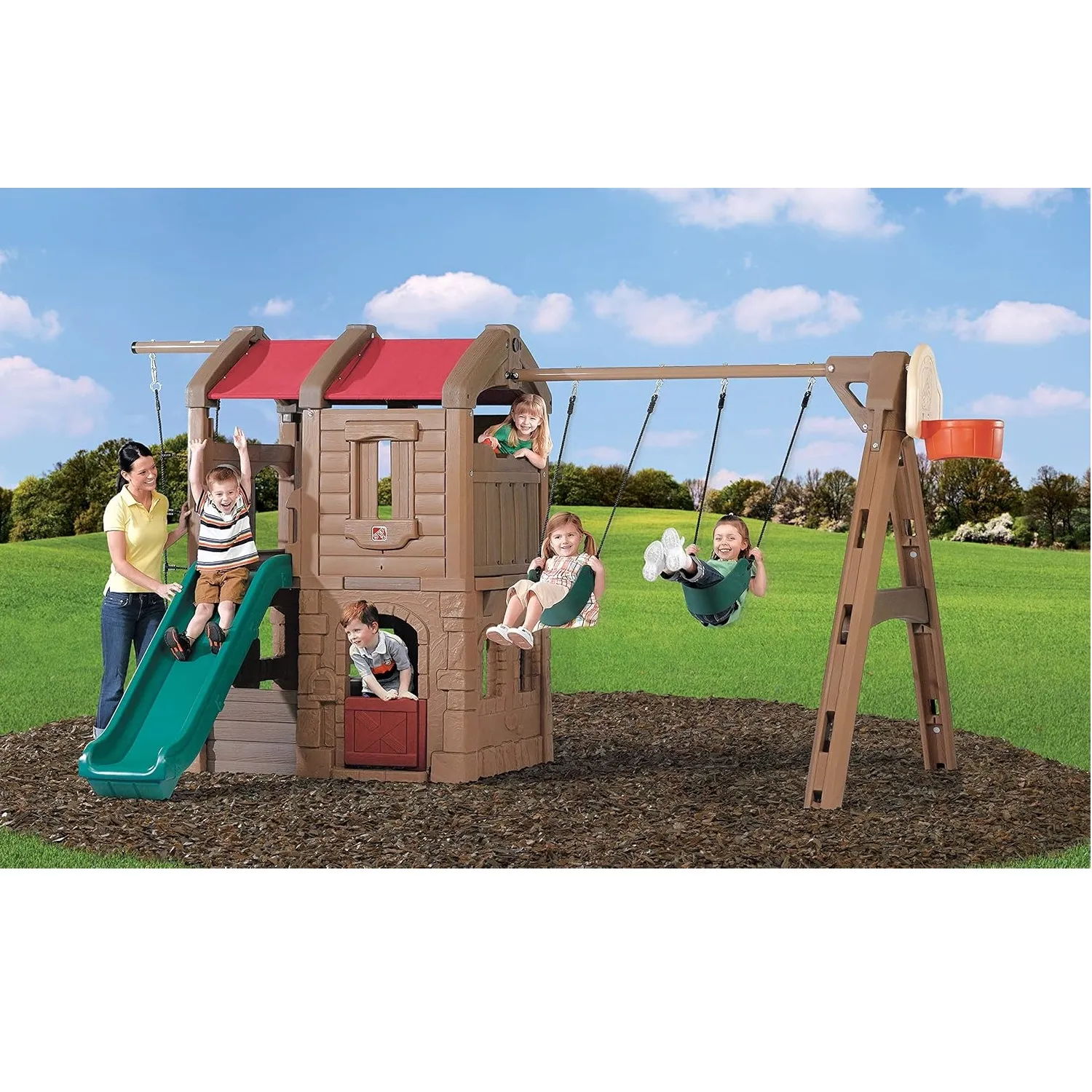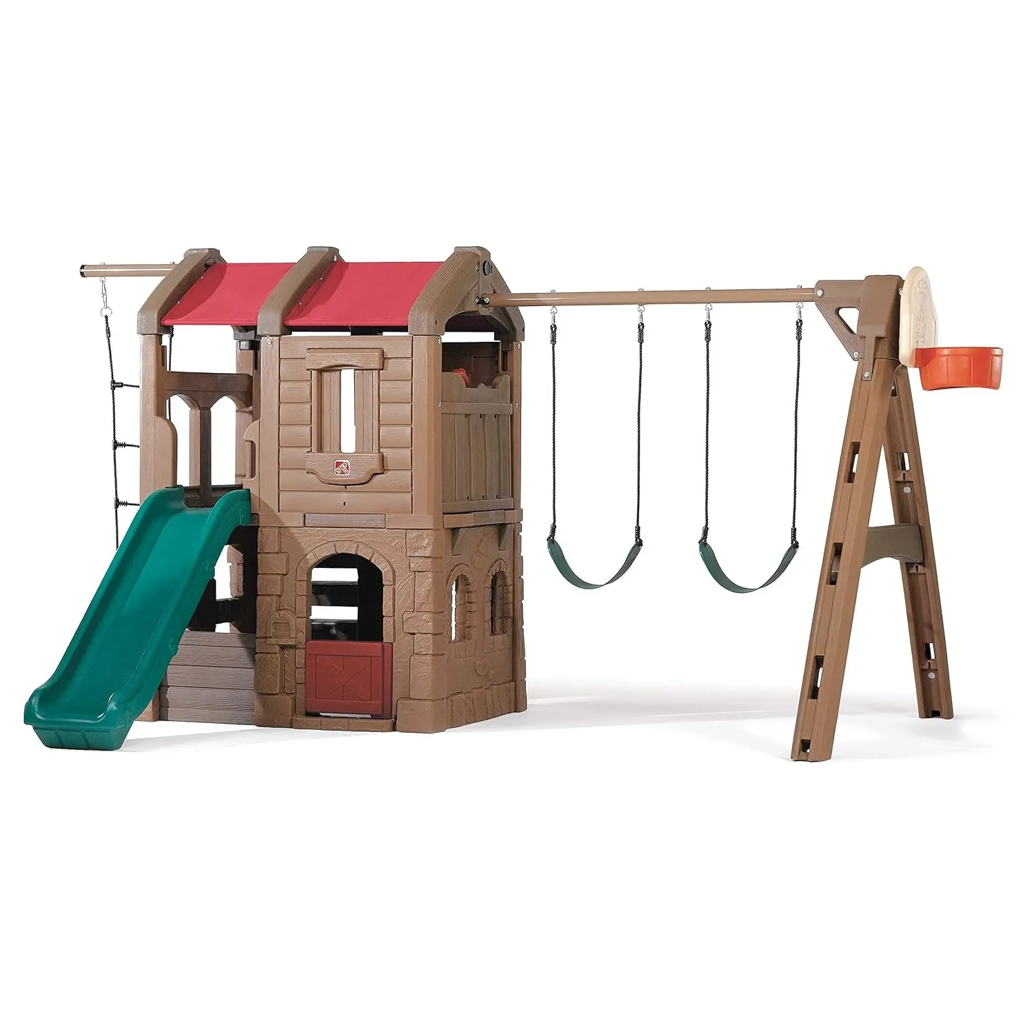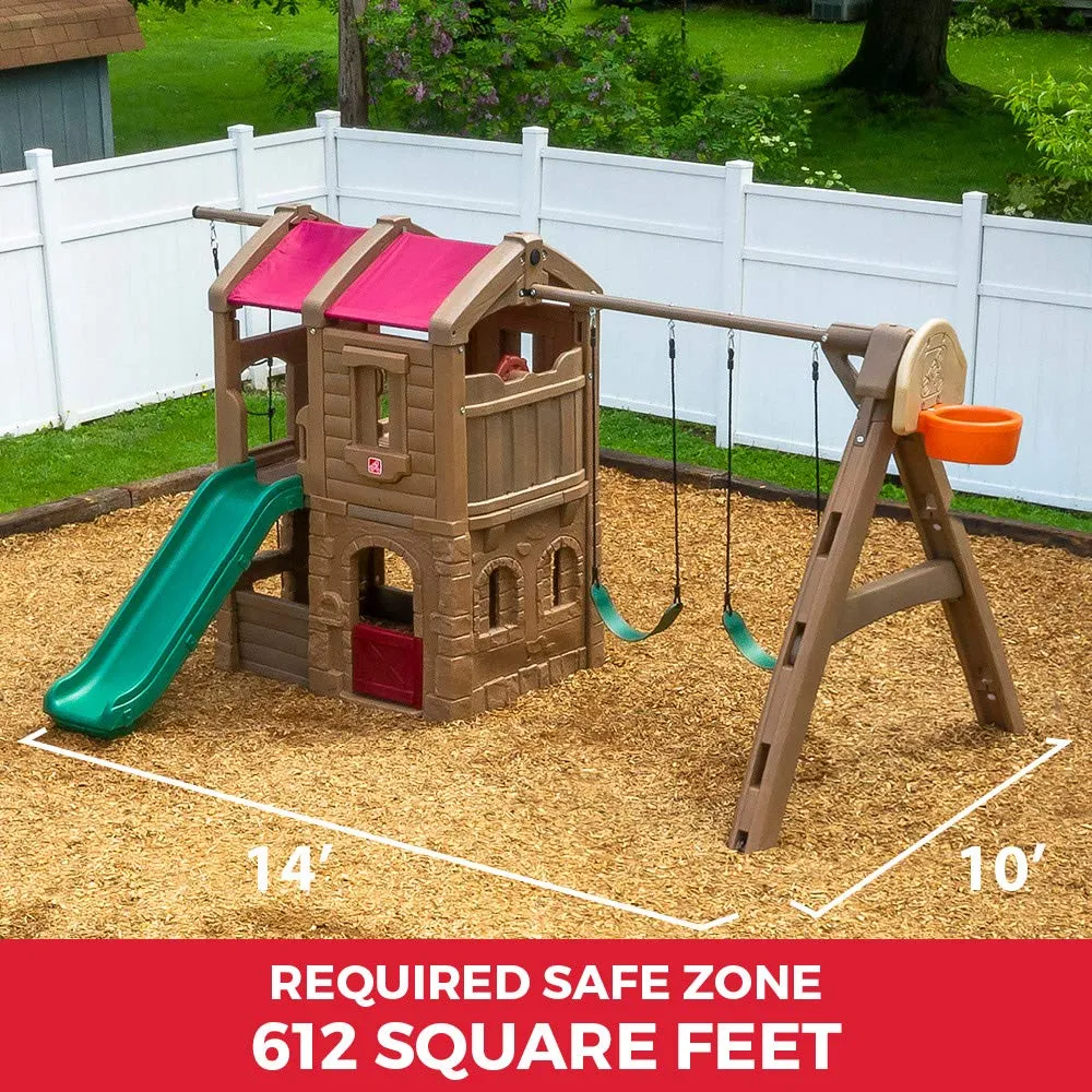 Complete with a two-story clubhouse this kids’ swing set has so many cool features to keep them entertained – and outside – with active play for hours! The Naturally Playful Adventure Lodge Play Center is a great way to get multiple kids outside socializing and playing together from the swings and clubhouse hiding spot with working door to the backboard hoop for a quick ball toss game (sorry ball not included) and more! Kids will enjoy climbing the rope ladder for a bird’s eye view of the backyard as well as the sturdy steps into the clubhouse to take the slide back down. Their imaginations will run wild with this backyard swing set and clubhouse for kids where pretend play awaits. Pretend the rustic lodge clubhouse is a pirate ship and use the steering wheel to escape enemy ships; fly through the sky with a make-believe airplane; and even cruise through the desert with a dune buggy – the pretend play possibilities are endless! Plus this swing set is sturdy and durable; made to last through the most active play for years with double-wall construction that’s fade resistant never chips or needs to be stained and is easy to clean. Secure the ground anchors to ensure this outdoor playset stays strong and in place for kids to enjoy for years to come! Made in USA of US and imported parts.