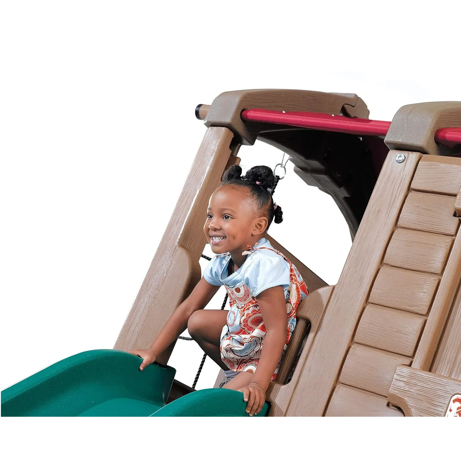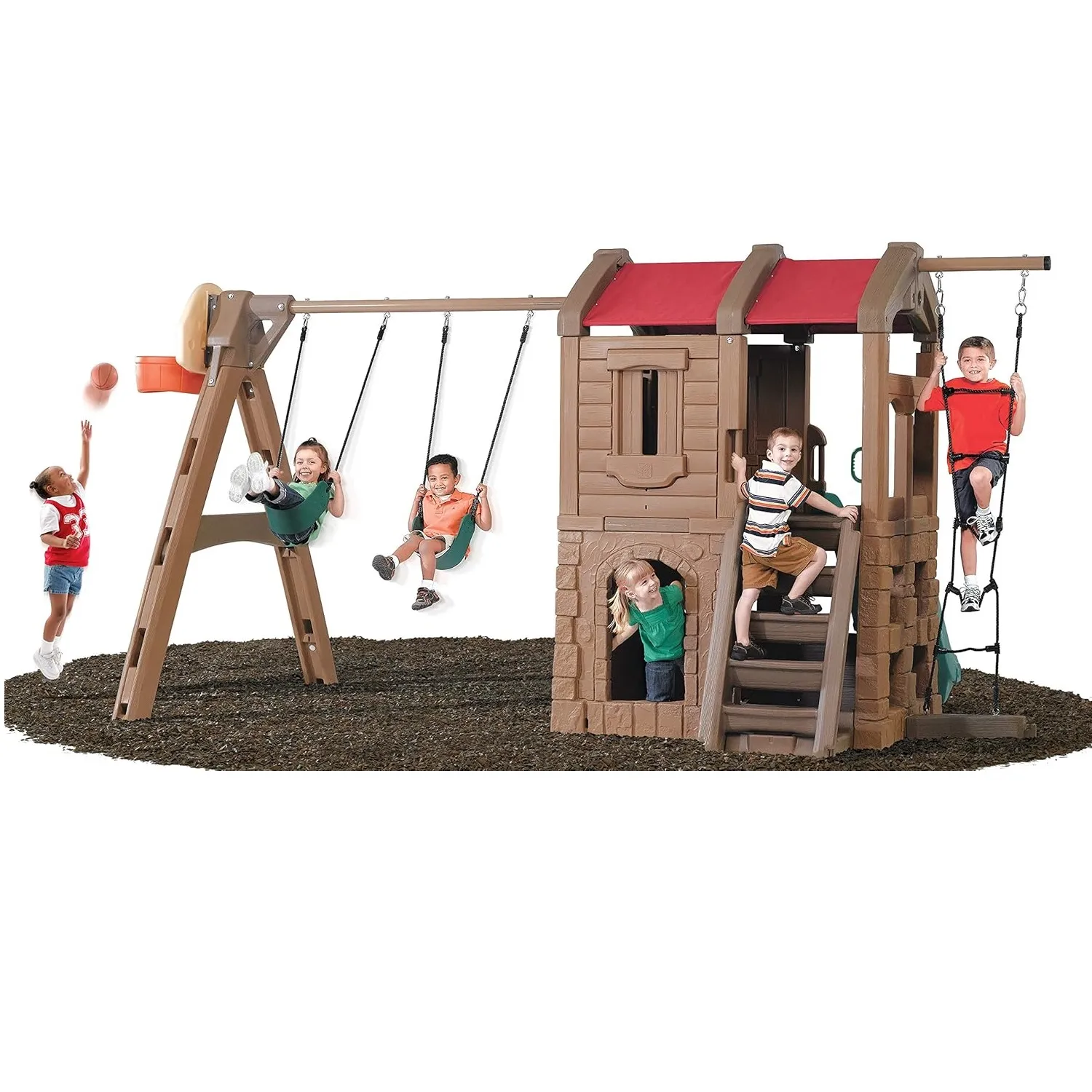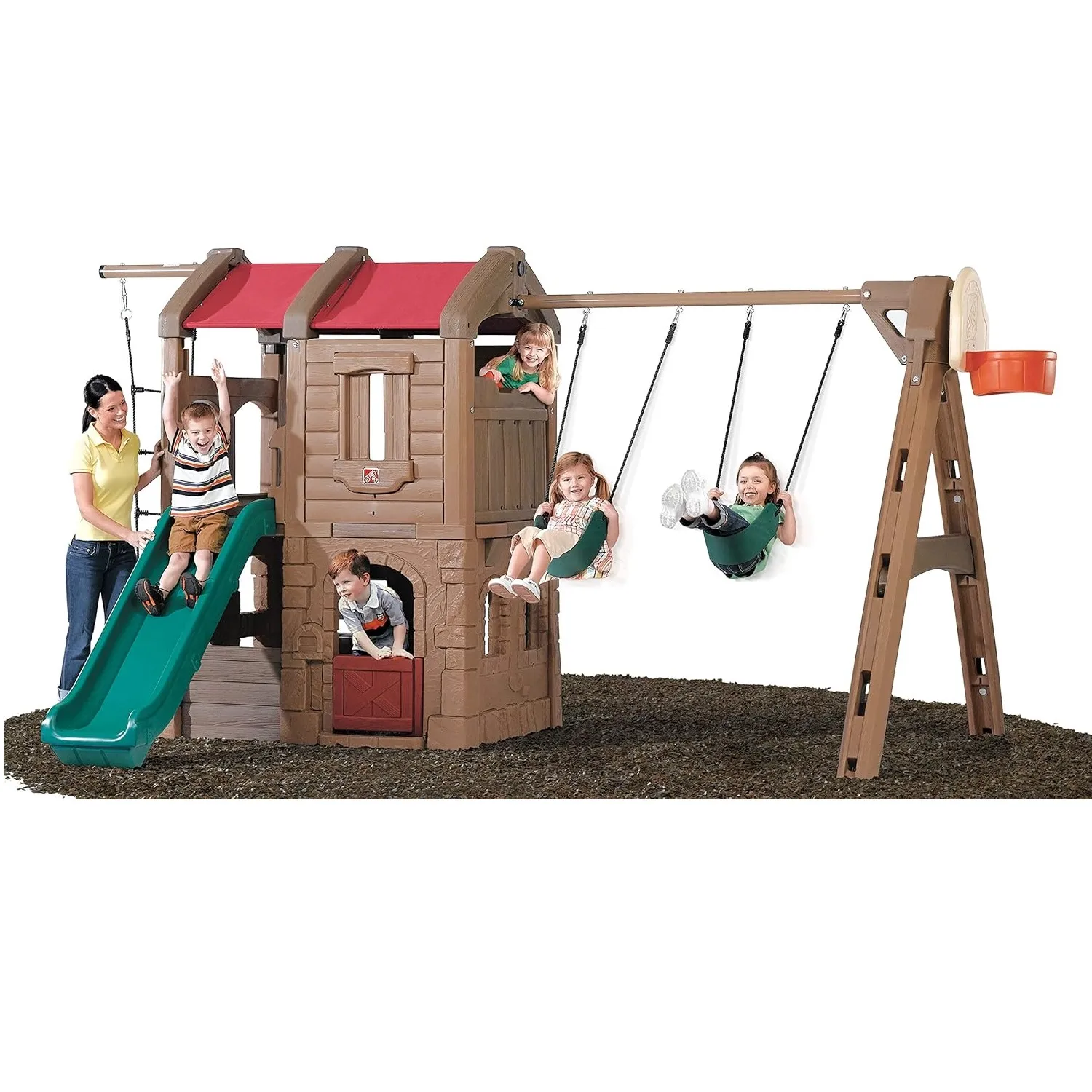 Complete with a two-story clubhouse this kids’ swing set has so many cool features to keep them entertained – and outside – with active play for hours! The Naturally Playful Adventure Lodge Play Center is a great way to get multiple kids outside socializing and playing together from the swings and clubhouse hiding spot with working door to the backboard hoop for a quick ball toss game (sorry ball not included) and more! Kids will enjoy climbing the rope ladder for a bird’s eye view of the backyard as well as the sturdy steps into the clubhouse to take the slide back down. Their imaginations will run wild with this backyard swing set and clubhouse for kids where pretend play awaits. Pretend the rustic lodge clubhouse is a pirate ship and use the steering wheel to escape enemy ships; fly through the sky with a make-believe airplane; and even cruise through the desert with a dune buggy – the pretend play possibilities are endless! Plus this swing set is sturdy and durable; made to last through the most active play for years with double-wall construction that’s fade resistant never chips or needs to be stained and is easy to clean. Secure the ground anchors to ensure this outdoor playset stays strong and in place for kids to enjoy for years to come! Made in USA of US and imported parts.