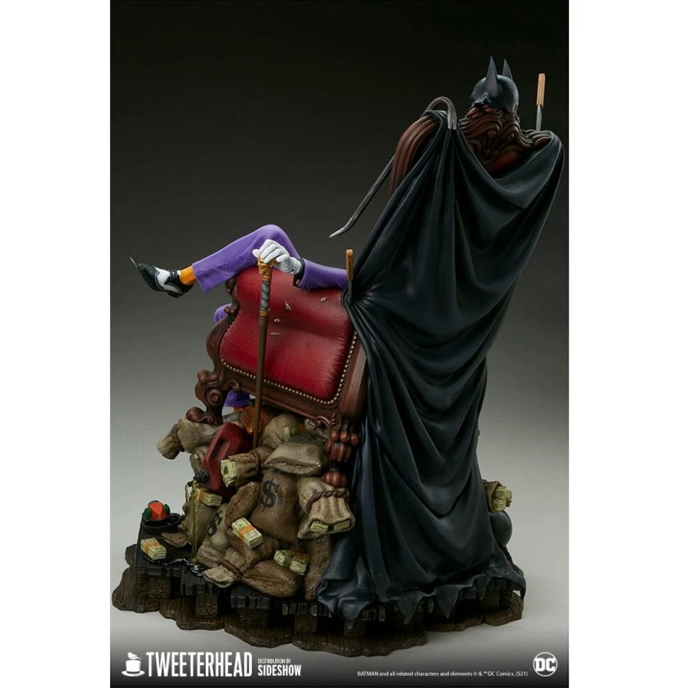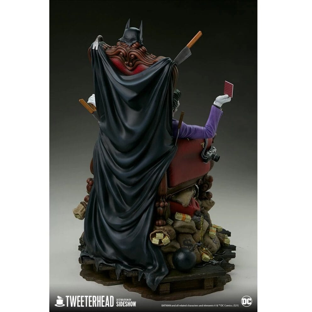 The Joker Deluxe Maquette measures close to 20.5” tall when fully assembled – from the bottom of base to the tippy top of the Batman’s cowl on the chair. This fully sculpted polyresin statue comes crammed with a bunch of craziness – Joker sitting atop his personalized throne with a Bat-cowl and cape, armed with his cane and bladed shoe. All nested on a giant pile of money bags, gasoline tanks, bombs, and endless knick-knacks and easter eggs, you’ll probably never stop finding something new to love in this piece.