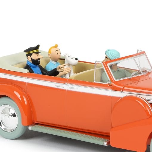 The New Delhi Taxi from Tintin in Tibet (1960). Tintin, Snowy and Captain Haddock during their stop over in New Delhi take the opportunity to visit the city. Time is short because the plane to Kathmandu leaves at 2.35. Captain Haddock after an unexpected ride on a sacred cow unintentionally hires a taxi which despite multiple twists gets them to the airport on time. This scene, imagined by Hergé, forced his collaborator Michel Demarets to look for a convertible that would suit the situation, he opted for the 1939 Cadillac Fleetwood.