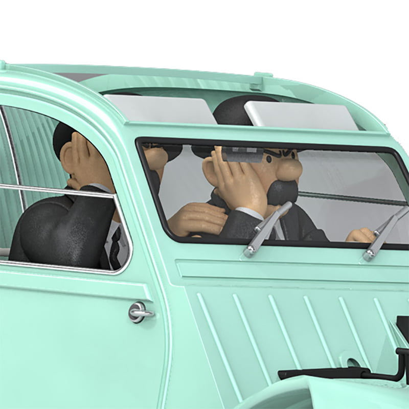 The Thompson’s crashed 2 CV from the 1961 adventure The Castafiore Emerald. So using Hergé’s drawings from pages 37 and 42 the clever model makers gave us the full car!