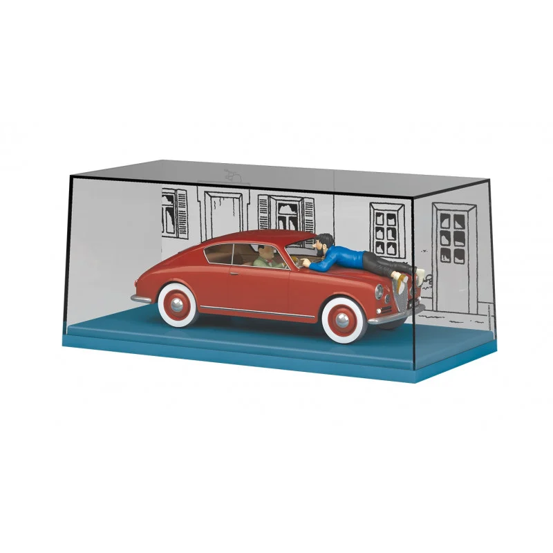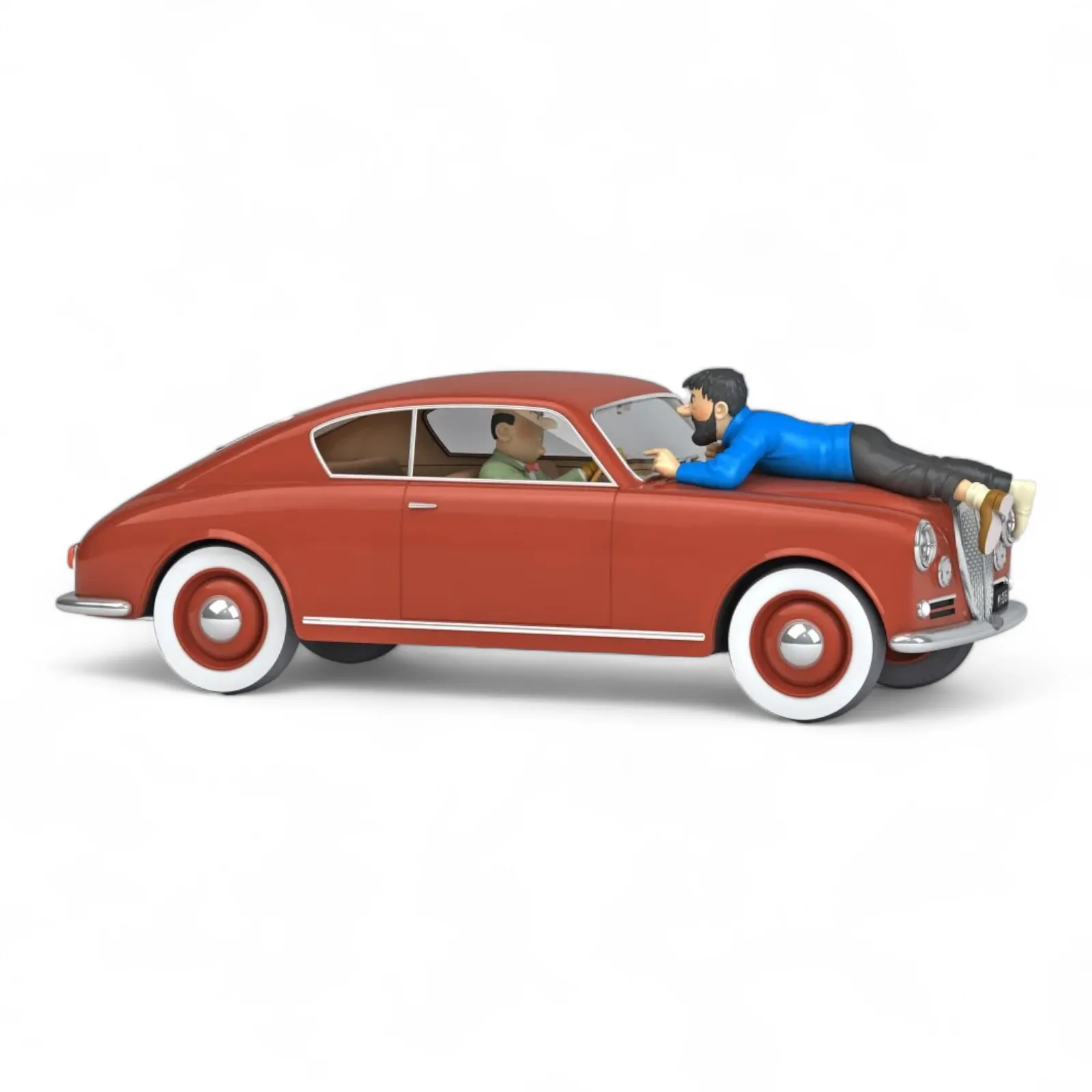 • In Switzerland, Tintin, Captain Haddock and Snowy are in pursuit of Sunflower’s kidnappers. This chase with twists and turns stops in a small village where Haddock crosses the main road to go to the tobacconist’s shop. A shrill screech followed by a frightful bang resounds! The captain has just been hit by a powerful sports car. The car in question is a Lancia Aurelia B20 faithfully reproduced by Hergé. This grand touring coupé owes its elegant lines to Felice Mario Boano, revised by the great coachbuilder Pinin Farina. In addition to this sleek line, a powerful V6 engine made this car a racing beast.