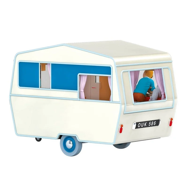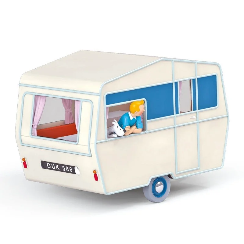 The caravan, Tintin and Snowy are hitching a lift in comfort ( but not for long!), the owners of the caravan are in a red triumph, sold separately from The Black Island.